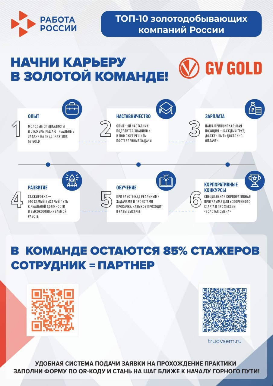АО «Высочайший» (GV Gold) – одно из наиболее динамично развивающихся горнодобывающих предприятий России, которое занимается открытой разработкой рудных месторождений и добычей золота на территории страны. Входит в ТОП-10 ведущих золотодобывающих предприятий России.