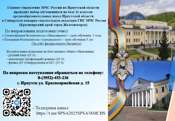 Главное управление МЧС России по Иркутской области проводит набор обучающихся на базе 11 классов среднеобразовательных школ Иркутской области в Сибирскую пожарно-спасательную академию ГПС МЧС России (Красноярский край город Железногорск)