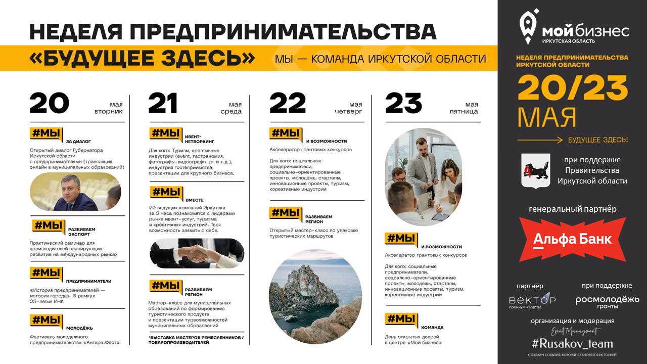 В рамках празднования Дня российского предпринимательства в регионе планируется проведение Недели предпринимательства "Будущее здесь", которая пройдет с 20 по 23 мая на площадке Центра "Мой бизнес" по адресу : г. Иркутск, ул. Рабочая , 2а/4.
