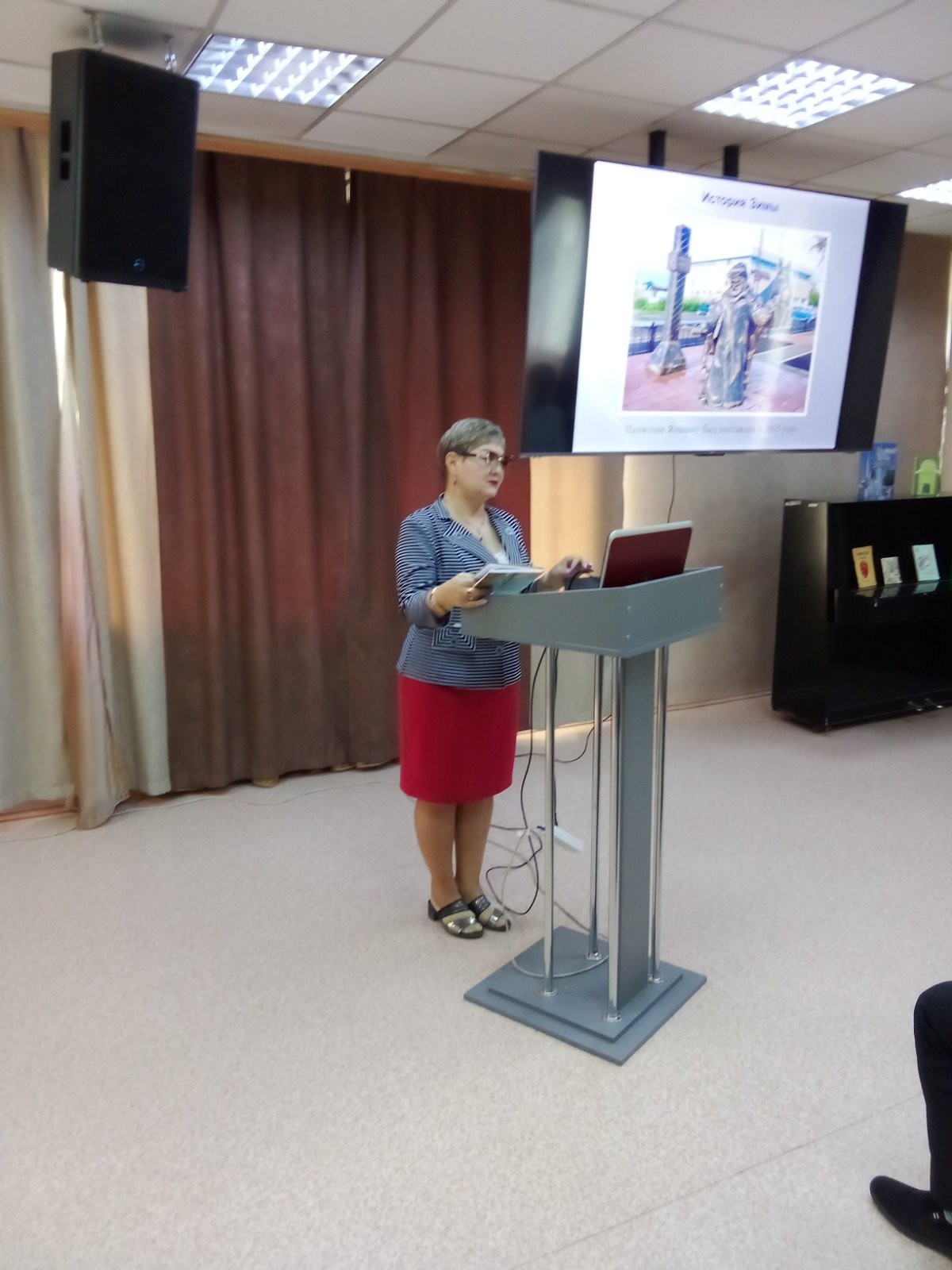 В День Знаний для учащихся десятых классов МБОУ "СОШ10" была проведена заочная историко-краеведческая экскурсия. Она была посвящена юбилею нашего города. Библиотекарь рассказала о памятниках и достопримечательностях Зимы. В проведении экскурсии ей помогали краеведы Лидия Митрофанова, Виталий Ануфриев и поэтесса Наталья Якимова.