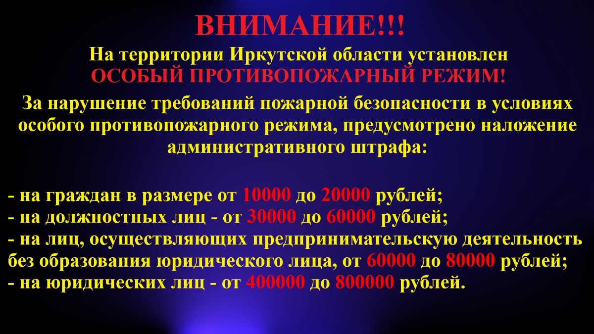 На основании вышеизложенного, администрация Зиминского городского муниципального образования предупреждает об ответственности за нарушения правил пожарной безопасности в условиях действия особого противопожарного режима.
