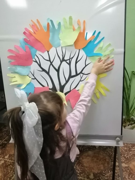 Итоговым продуктом встречи стало «Дерево дружбы», на которое вместо лепестков, дети крепили трафареты своих ладошек. «Листики» получились разные и по цвету, и по форме, но в целом получилось яркое, необычное дерево, ожившее благодаря ребятам.