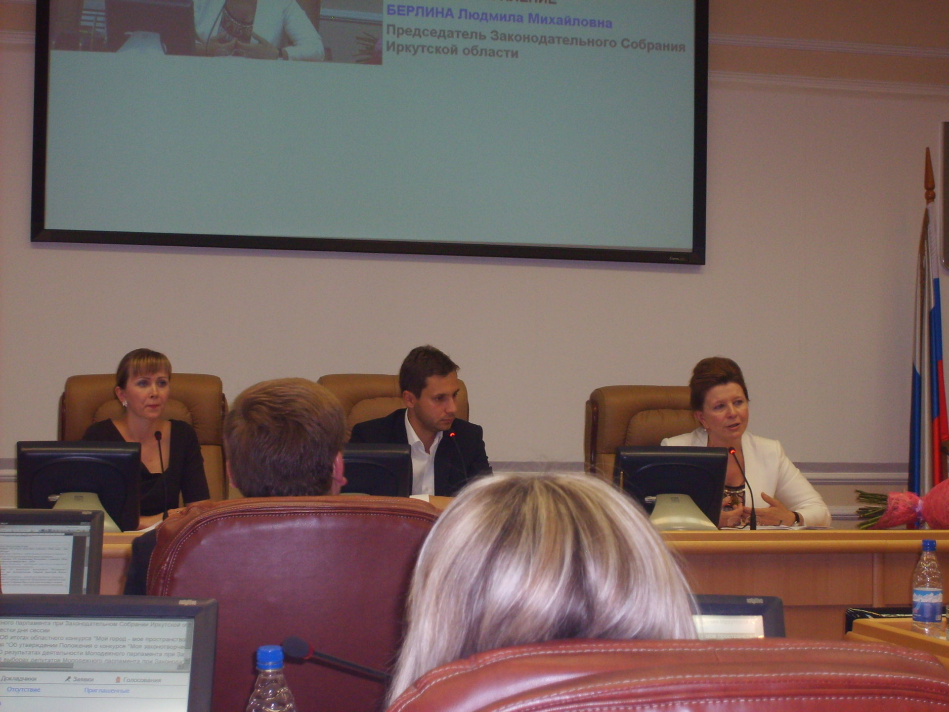 06.09.2013г. состоялось заседание заключительной 16 сессии Молодежного парламента при Законодательном Собрании Иркутской области. Председатель Законодательного Собрания Л.Берлина вручила благодарности депутатам, принимавшим активное участие в мероприятиях, акциях и конкурсах Молодежного парламента в течении четырех лет (В.Алферовой, П.Кузнецову, П.Березовскому, Д.Турушеву и Л.Магдановой). «Сильный характер – это не сколько раз человек упал, а сколько раз поднялся». «Лучше износиться, чем заржаветь»,- отметила Л.Берлина. На сессии обсудили результаты конкурса «Мой город – мое пространство», который направлен на то, чтобы обратить внимание на окружающую нас действительность, возможность изменить ее. На участие в конкурсе было получено 84 заявки от молодых жителей Иркутской области. Победителями стали 12 проектов-призеров.
