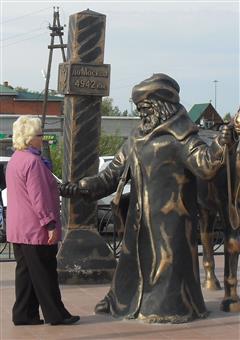 Парковая композиция (ямщик, лошадь и верстовой столб) дело рук ангарского художника Ивана Зуева из компании «Лукоморье». Надо отметить, скульптура изготовлена в натуральную величину, к ней можно подойти, сфотографироваться, сесть на лошадку. Весом сооружение более 5 тонн, из бетона и стали, сверху покрашено специальной краской для парковых скульптур.