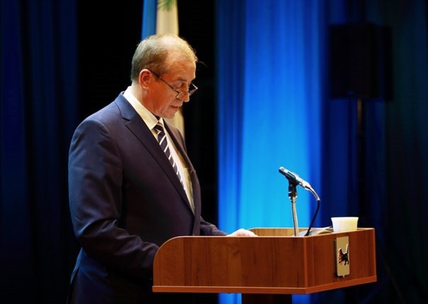 Сегодня мы переживаем непростые времена. Наличие внешних угроз, воздействие экономических санкций, нестабильность на рынке энергоносителей серьезно осложняют финансово экономическое положение России. Мы живем в условиях дефицита Федерального бюджета, который, в случае дальнейшего падения цен на нефть, может превысить три триллиона рублей. Есть угроза снижения финансирования из государственной казны программ, касающихся развития регионов. Поэтому сейчас настало то время, когда нам всем нужно думать не только о том, что регион может взять из Центра, но и о том, что он может сделать для всей страны. Для этого нужна консолидация, работа на результат и открытость власти. В своей деятельности я и правительство Иркутской области будем руководствоваться следующими принципами: в управлении – открытость, в развитии – конкретность, в расходах – экономность, в политике – честность. К этому призываю и всех участников экономических, политических и общественных процессов.