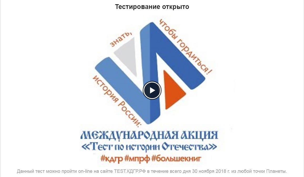 Четвертая международная акция «Тест по истории Отечества» состоится 30 ноября. Тестирование по истории Отечества представляет собой масштабную образовательную акцию, которая пройдет уже в четвертый раз и «охватит все регионы РФ и несколько десятков стран».