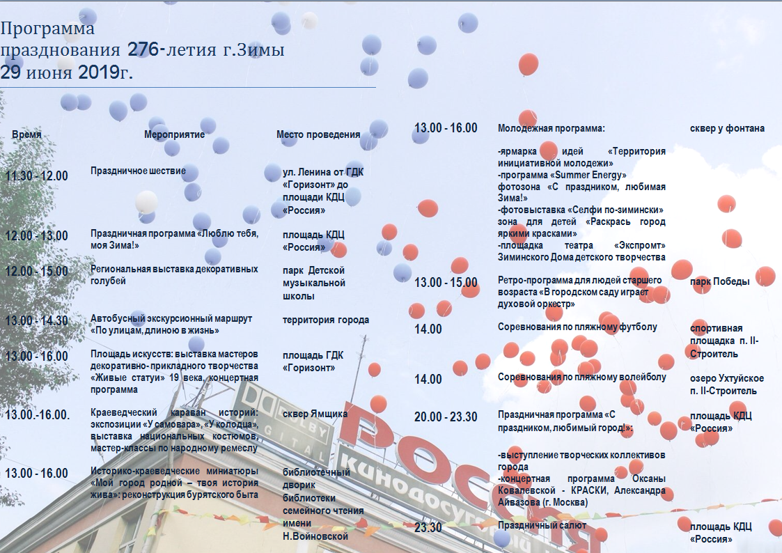 Уважаемые зиминцы и гости нашего города! 29 июня приглашаем на праздничные мероприятия, посвящённые 276-летию Зимы.