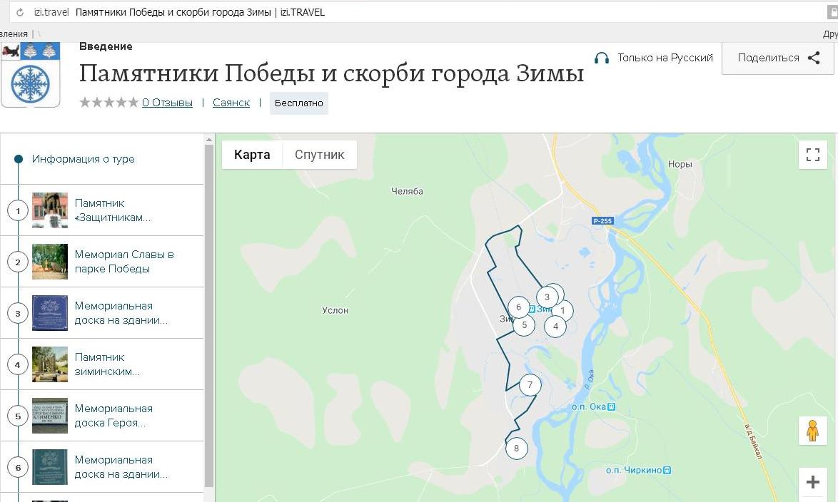 Первой на портал «izi TRAVEL» добавлена экскурсия «Памятники Победы и скорби города Зимы», которая посвящена 75-летию со дня окончания Великой Отечественной войны 1941-1945 годов. Маршрут экскурсии объединяет памятники, мемориальные доски, стелы, которые посвящены событиям Великой Отечественной войны и памяти, участвовавших в ней зиминцев. На сайте «izi TRAVEL» вы можете виртуально пройти по маршруту экскурсии, и познакомится с краткой информацией о каждом из восьми представленных в ней объектах.