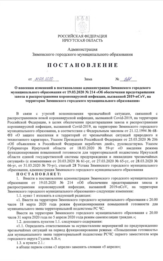 Постановление о внесении изменений в постановление №214 от 19.03.2020 "Об обеспечении предотвращения завоза и распространения коронавирусной инфекции, вызванной 2019-nCOV, на территории ЗГМО".