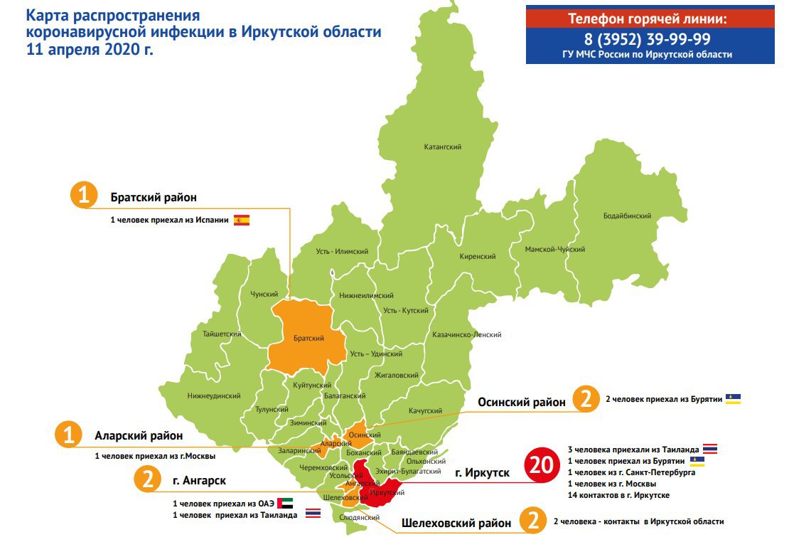 Карта распространения коронавирусной инфекции на территории Иркутской области за 11.04.2020