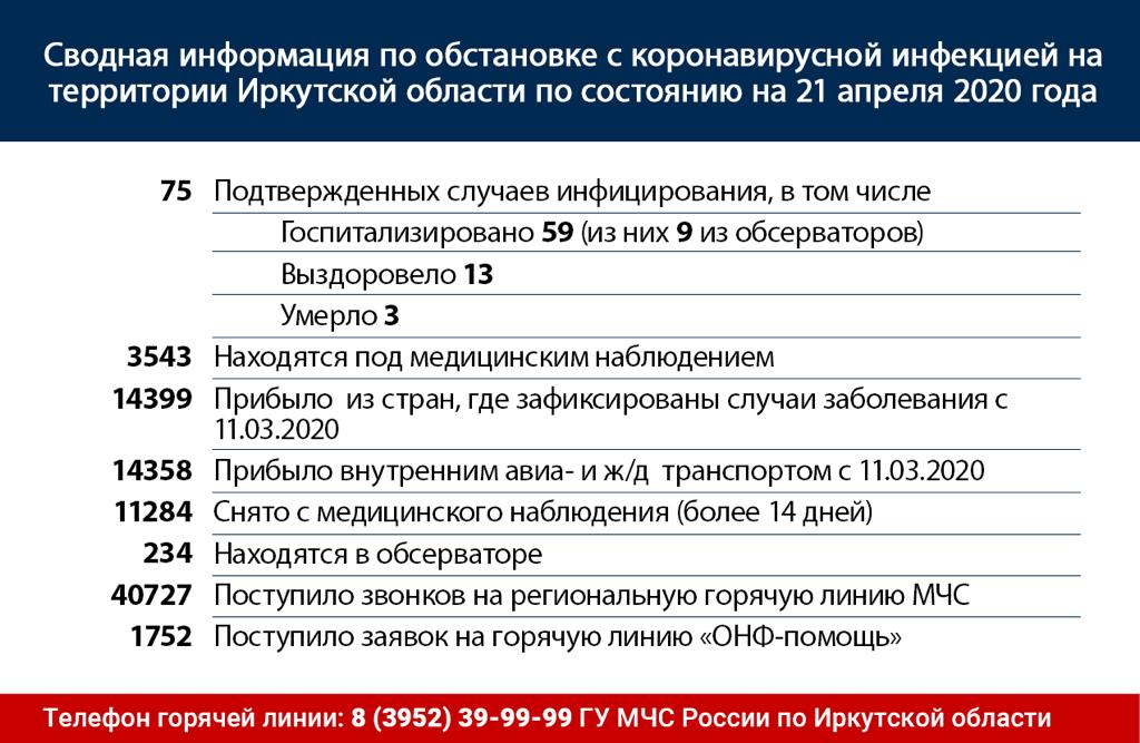 Сводная информация по обстановке с коронавирусной инфекцией на территории Иркутской области на 21.04.20