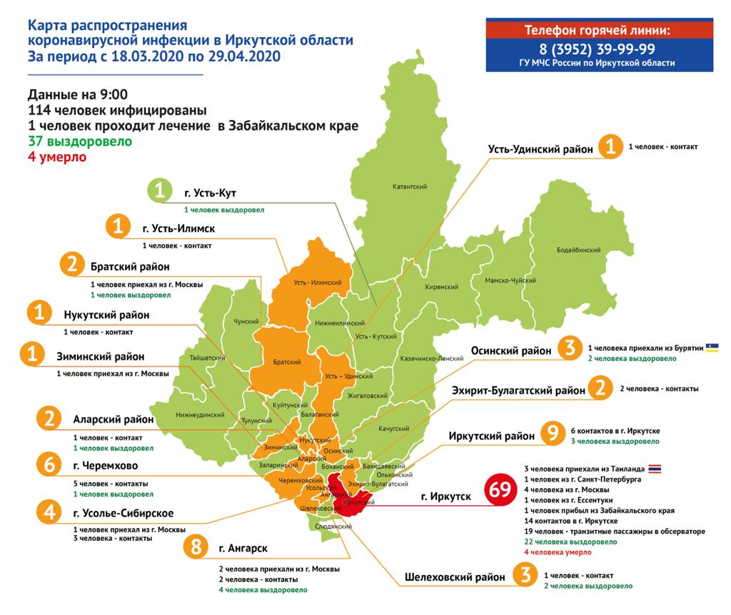 Карта распространения коронавирусной инфекции на территории Иркутской области за 29.04.2020