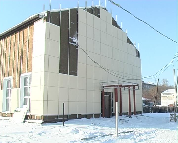 Январские морозы (до – 44) на несколько дней затормозили работы строителей по облицовке фасада здания. Как только позволят уличные температуры, подрядчик возобновит наружную отделку постройки поверх теплоизоляционного слоя – металлическими кассетными панелями. По облицовке спортивного зала уже видно, что она светло-бежевого цвета.