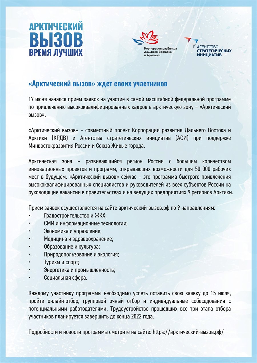 Подробности и новости программы смотрите на сайте: https://арктический-вызов.рф/