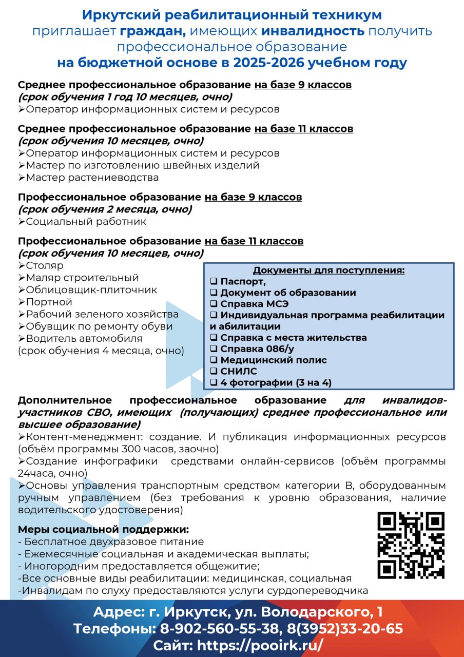 Иркутский реабилитационный техникум приглашает граждан, имеющих инвалидность получить профессиональное образование на бюджетной основе в 2025-2026 учебном году