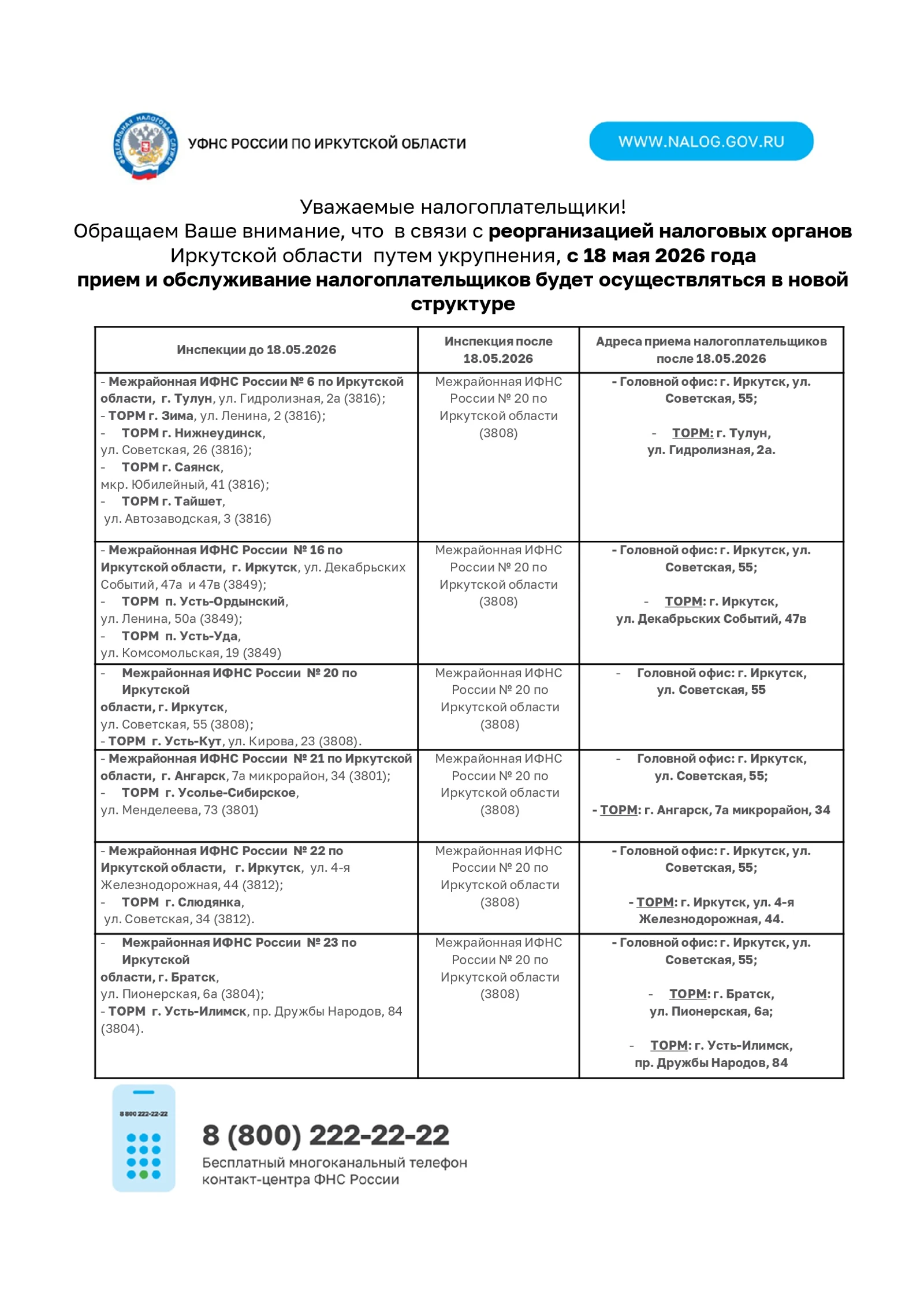 С 18 мая 2026 года прием и обслуживание налогоплательщиков будет осуществляться в новой стpyктype