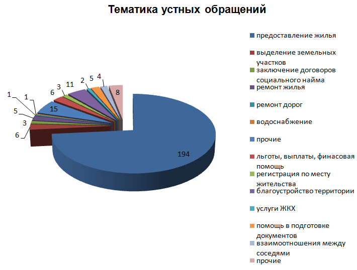 В структуре обращений по-прежнему актуальными для жителей города остаются жилищные вопросы (предоставление, ремонт, обследование жилья, заключение договоров социального найма, регистрация по месту жительства), а также ремонт дорог, вывоз и утилизация твердых коммунальных отходов, благоустройство территорий, земельные вопросы (предоставление земельных участков в аренду, в собственность), вопросы, оказания услуг ЖКХ, работы общественного транспорта, отлова безнадзорных животных, экологии.