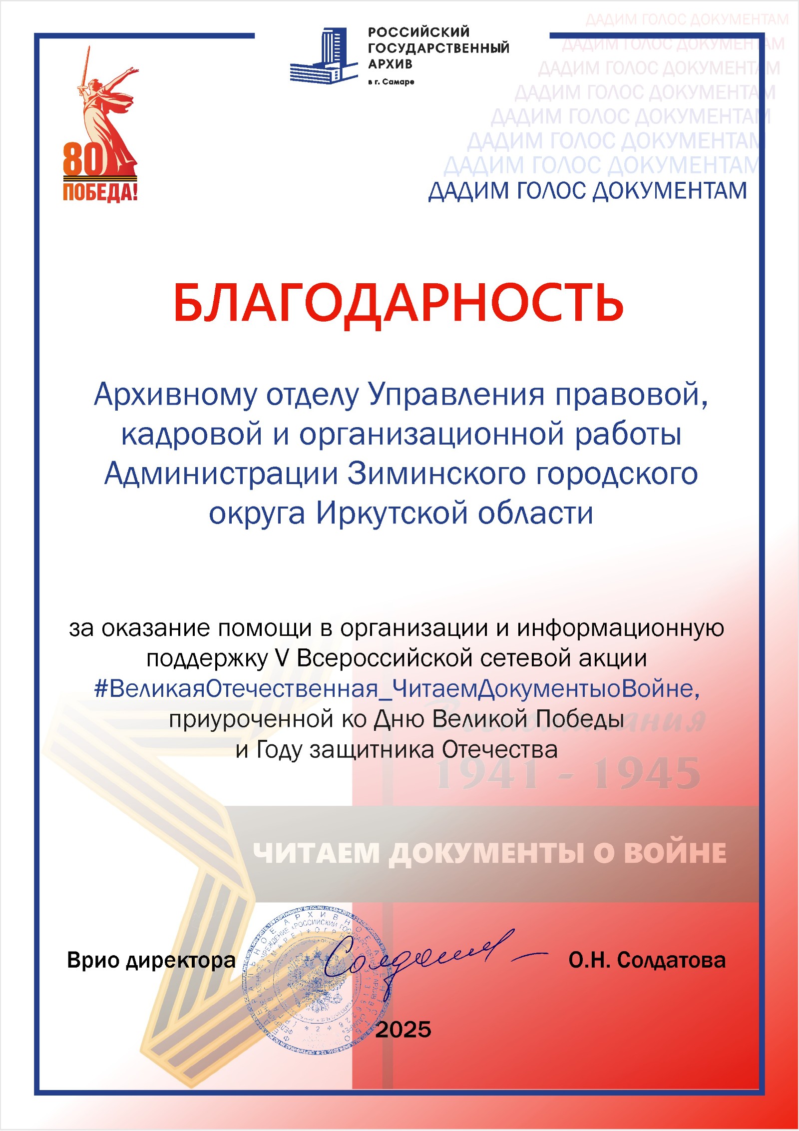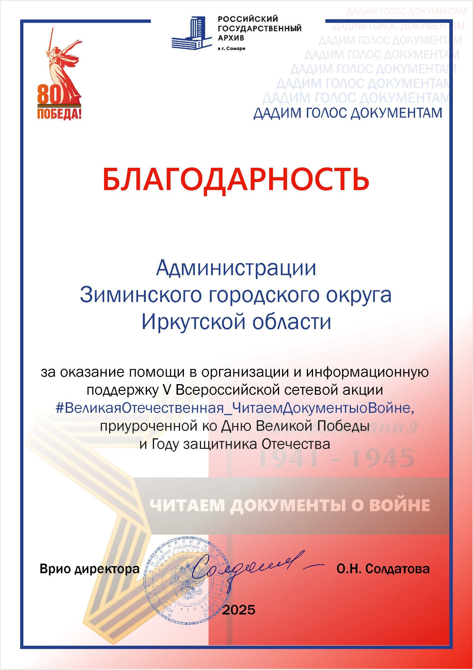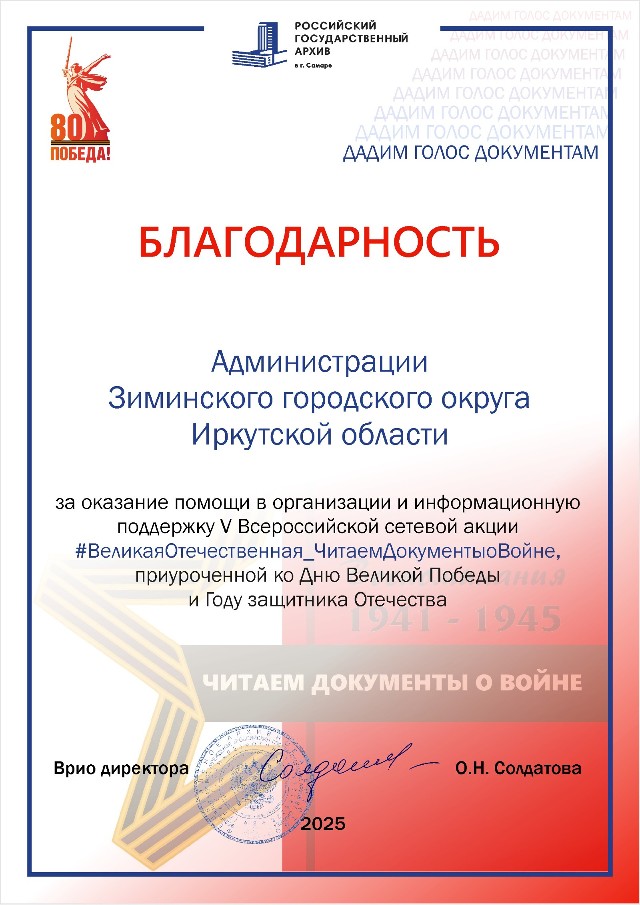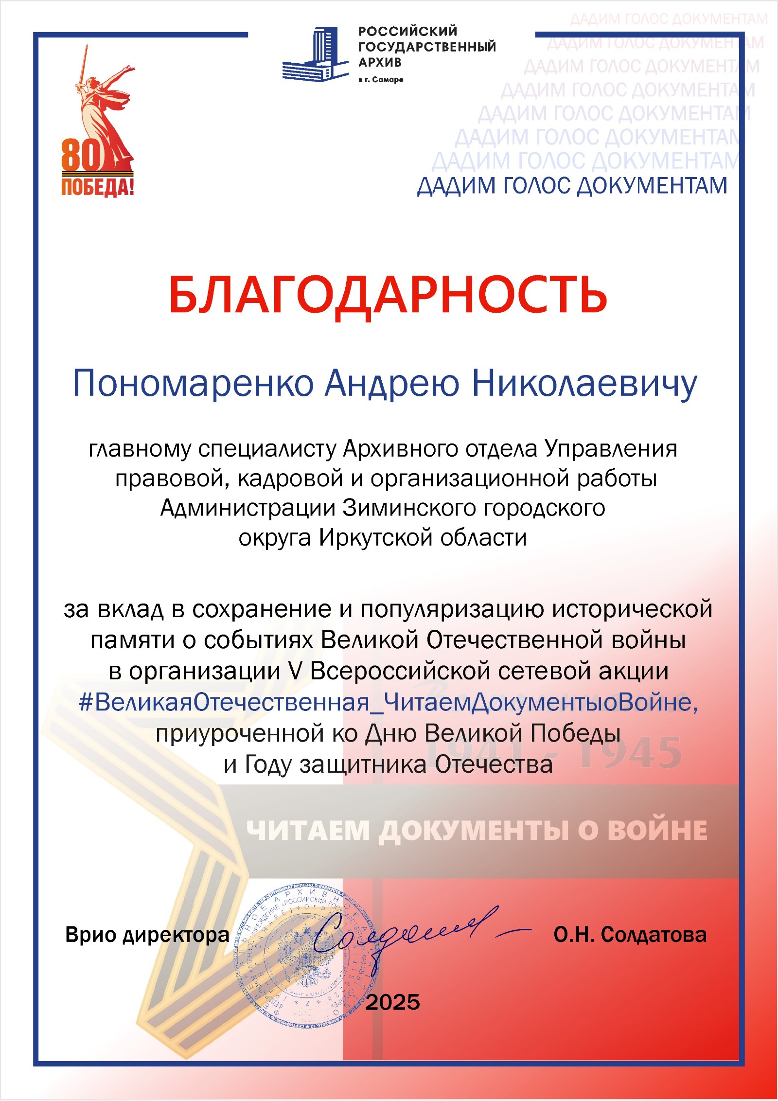 Документ читает Пономаренко Андрей Николаевич, главный специалист архивного отдела управления правовой, кадровой и организационной работы администрации Зиминского городского округа Иркутской области.