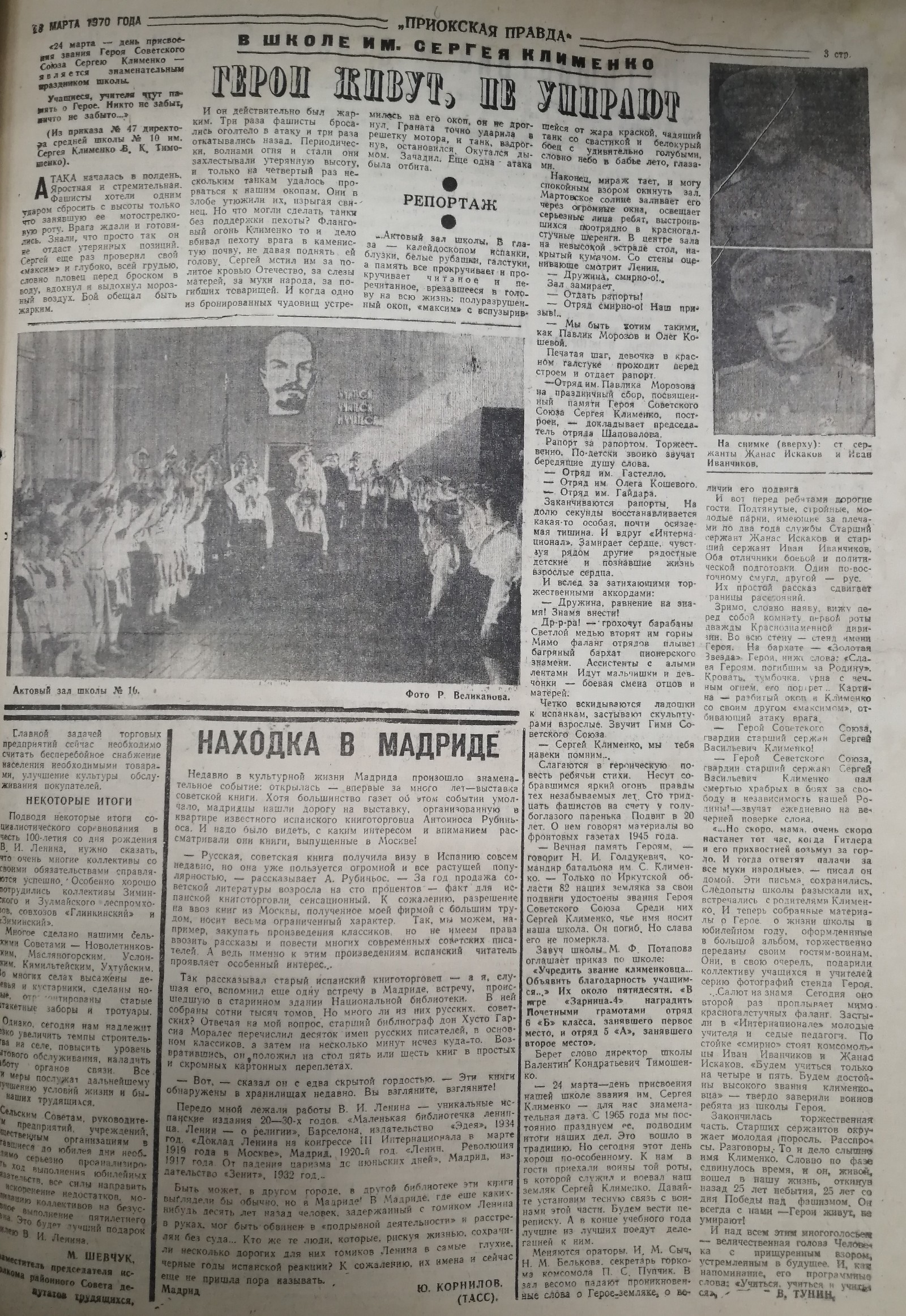 Статья опубликована в газете «Приокская правда» № 50 от 28 марта 1970 года и называется «Герои живут, не умирают». Основание: фонд Р – 13, опись № 1, единица хранения 19, лист 50.