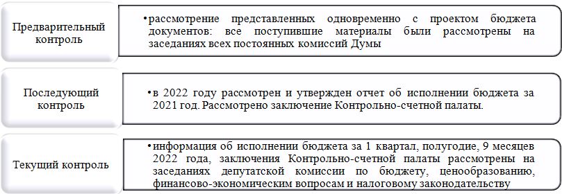 Ежегодно не позднее 1 мая администрация представляет в Думу отчет об исполнении бюджета за отчетный финансовый год. Порядок рассмотрения отчета об исполнении бюджета регулируется Положением о бюджетном процессе. В течение отчетного года в процессе организации формирования и исполнения местного бюджета Дума осуществляла следующие контрольные полномочия: