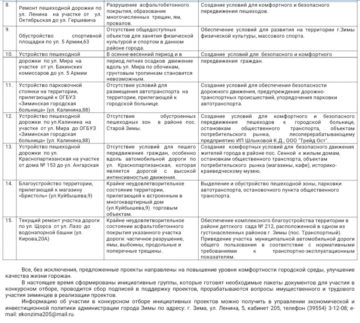 ☎ Информацию об участии в конкурсном отборе инициативных проектов можно получить в управлении экономической и инвестиционной политики администрации города Зимы по адресу: г. Зима, ул. Ленина, 5, кабинет 205, телефон (39554) 3-12-08; e-mail: ekonzima205@mail.ru.