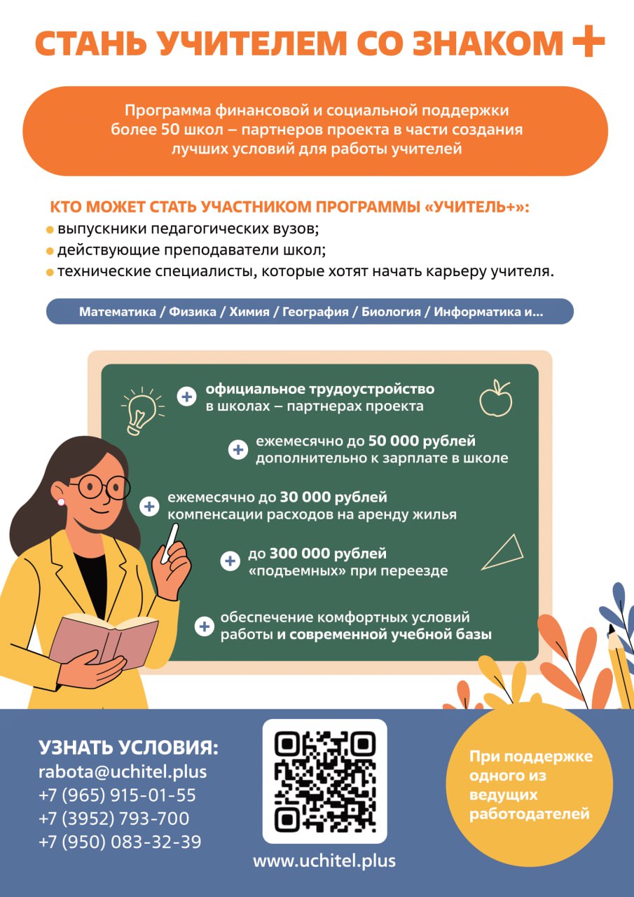 Мы верим, что педагог не должен выбирать между доходом и призванием. Поэтому при поддержке одного из ведущих работодателей региона предлагаем дополнительный пакет долгосрочных финансовых и социальных гарантий для учителей.