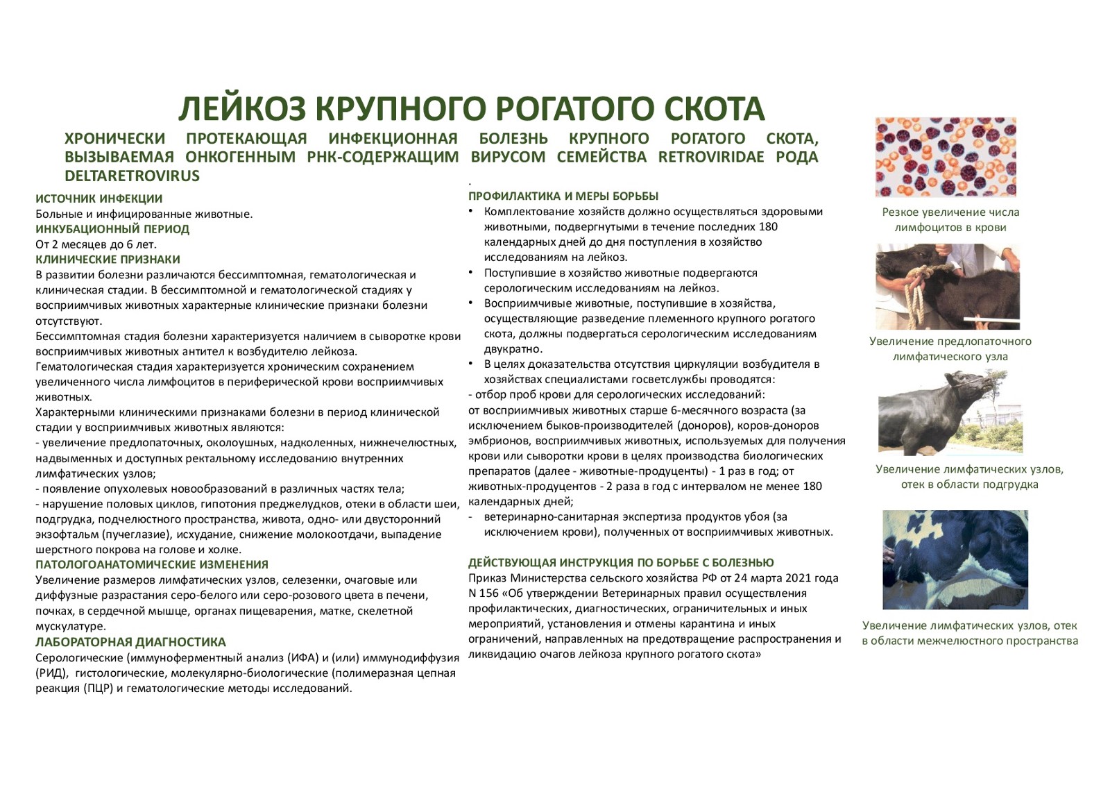 Лейкоз крупного рогатого скота (гемобластоз) – хроническая ретровирусная пролиферативная болезнь, характеризующая диффузной инфильтрацией тканей и появлением опухолей, на начальных стадиях протекающая бессимптомно. Вирусный лейкоз КРС на поздних стадиях выявляется по лимфоцитозу и злокачественному разрастанию кроветворных и лимфоидных клеток в различных органах. Диагностика: РИД и ИФА. Источником этой болезни становится крупный рогатый скот, инфицированный вирусом лейкоза. Возбудитель болезни передается внутриутробно от больных и инфицированных вирусом лейкоза КРС коров — матерей, спермой быков-производителей содержащих следы крови, при взятии крови, вакцинации, химиотерапии одной и той же иглой, вирус может передаваться через молоко больных коров телятам. Основной метод при искоренении лейкоза КРС – выбраковка. При проведении противолейкозных мероприятий на крупных стадах не более 3% заболевших коров приходится сдавать на мясо, не допуская развития у них опухолевых поражений. Плановые оздоровительные мероприятия обеспечивают получение максимального количества молока и потомства, позволяют сохранить и приумножить генофонд ценных высокопродуктивных животных.