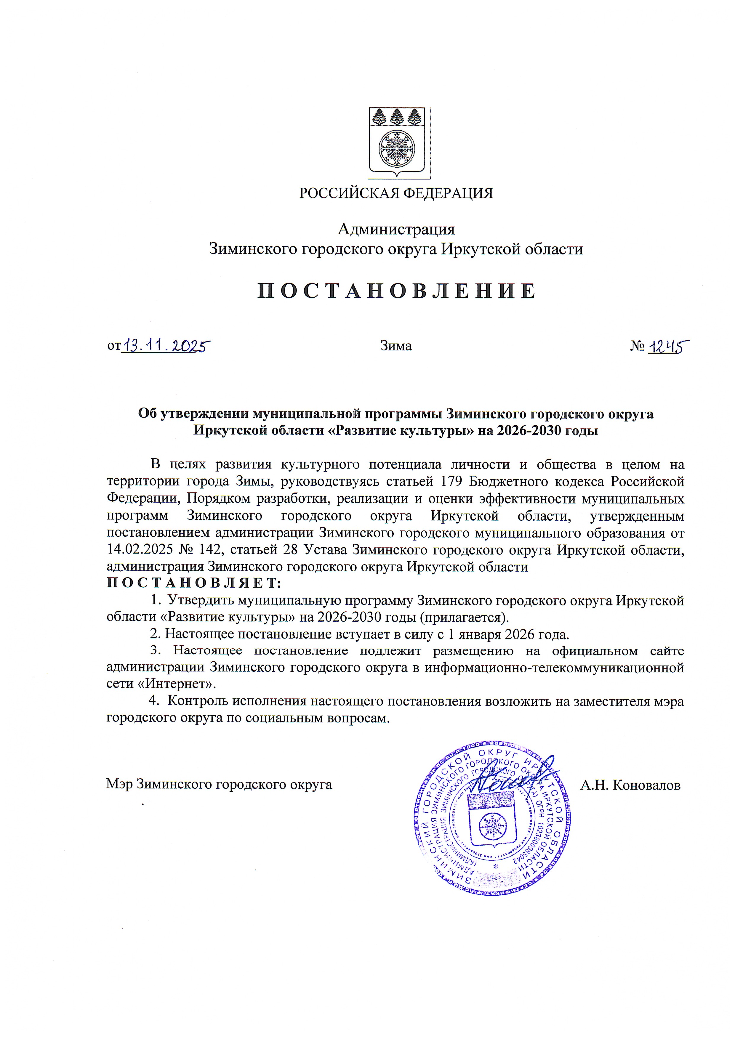 Постановление администрации Зиминского городского округа Иркутской области от 13.11.2025 № 1245 "Об утверждении муниципальной программы Зиминского городского округа Иркутской области "Развитие культуры" на 2026-2030 годы"
