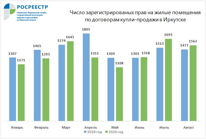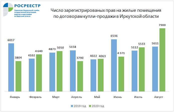 В августе 2020 года Управлением Росреестра по Иркутской области по договорам купли-продажи зарегистрировано почти 8 тысяч прав на жилую недвижимость, что более чем на треть (+43%) выше июльского показателя – 5,5 тысяч прав. По отношению к августу 2019 года показатель увеличился на 41%.