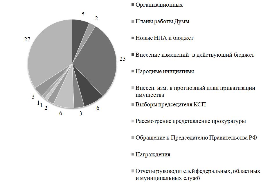 С точки зрения структуры рассматриваемых вопросов и принятых городской Думой решений в разрезе сфер правового регулирования, анализ последних трех лет показал, что приоритетными и наибольшими по количеству остаются вопросы местного самоуправления; далее неизменно идут решения городской Думы, связанные с вопросами благоустройства, строительства и развития города. В 2020 году увеличилось число принятых решений, связанных с бюджетом и налоговой политикой. Приоритетными остаются социальная сфера, образование, культура и спорт.