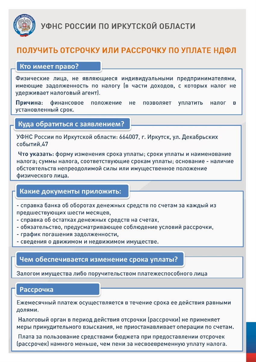 Физические лица, не являющиеся индивидуальными предпринимателями, имеющие задолженность по НДФЛ (в части доходов, с которых налог не удерживает налоговый агент), могут получить отсрочку или рассрочку по его уплате. Для этого необходимо обратиться с заявлением в УФНС России по Иркутской области (664007, г. Иркутск, ул. Декабрьских событий,47).