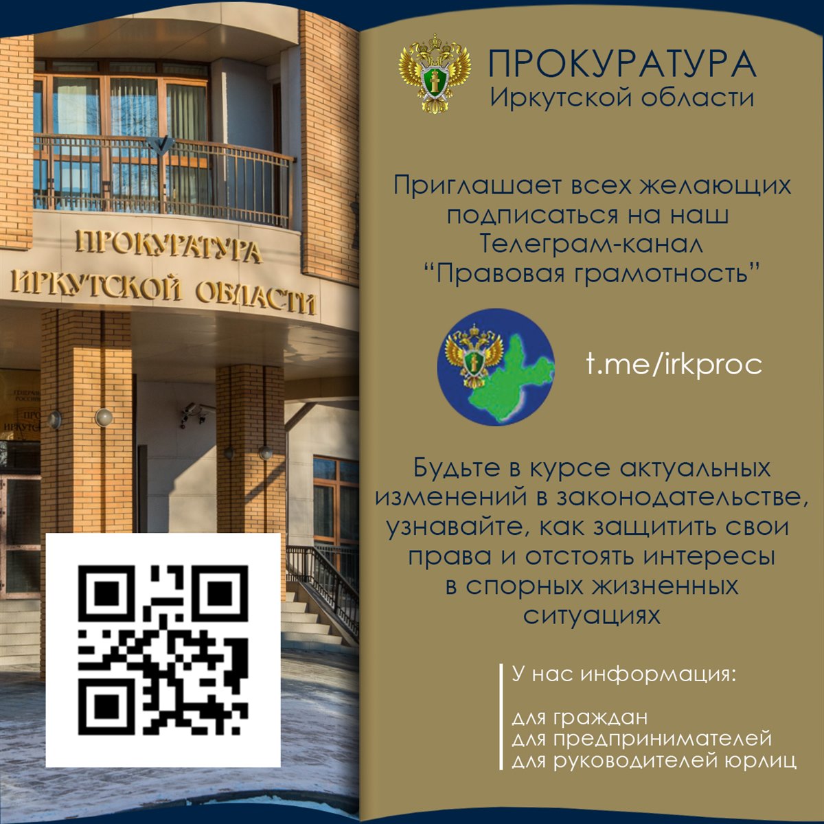 Прокуратура Иркутской области приглашает всех желающих подписаться на наш Телеграм-канал "Правовая грамотность"