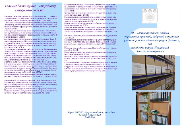 - распоряжение администрации Зиминского городского муниципального образования от 14.11.2024 № 164 " Об утверждении плана мероприятий по популяризации архивного волонтерства и привлечения добровольцев к помощи в восстановлении истории семьи на 2025 год".