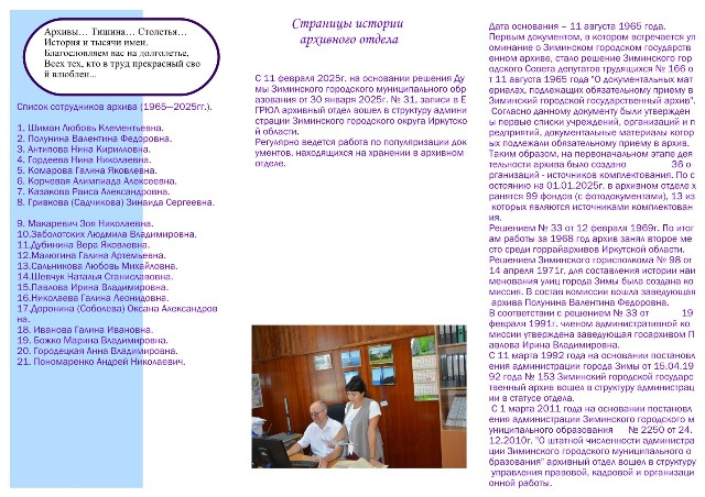 За незаметной (на первый взгляд) работой сотрудников архива создаются необходимые условия для сохранности документов, важнейших с исторической точки зрения, решаются социально - правовые вопросы граждан. История Зимы и Зиминского района продолжается. Фонды архивного отдела постоянно пополняются новыми документами.