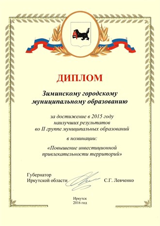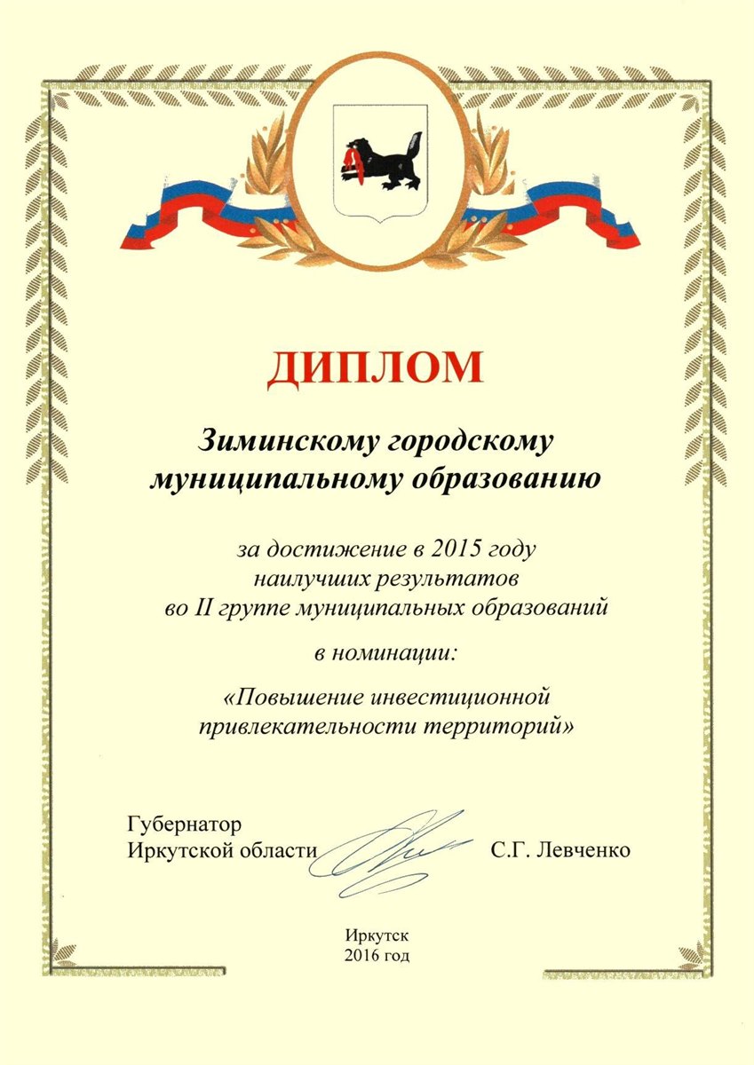 Диплом за достижение в 2015 году наилучших результатов во II группе муниципальных образований в номинации: «Повышение инвестиционной привлекательности территорий».