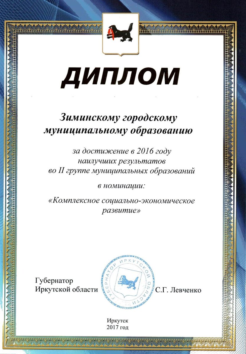 Диплом за достижение в 2016 году наилучших результатов во II группе муниципальных образований в номинации: «Комплексное социально-экономическое развитие»