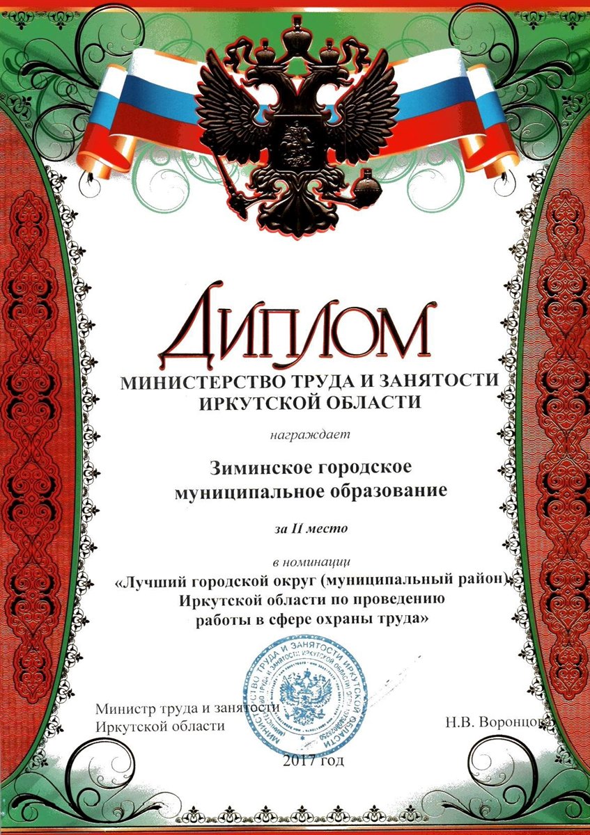 Диплом за II место в конкурсе Лучший городской округ (муниципальный район) Иркутской области по проведению работы в сфере охраны труда», 2017 год.