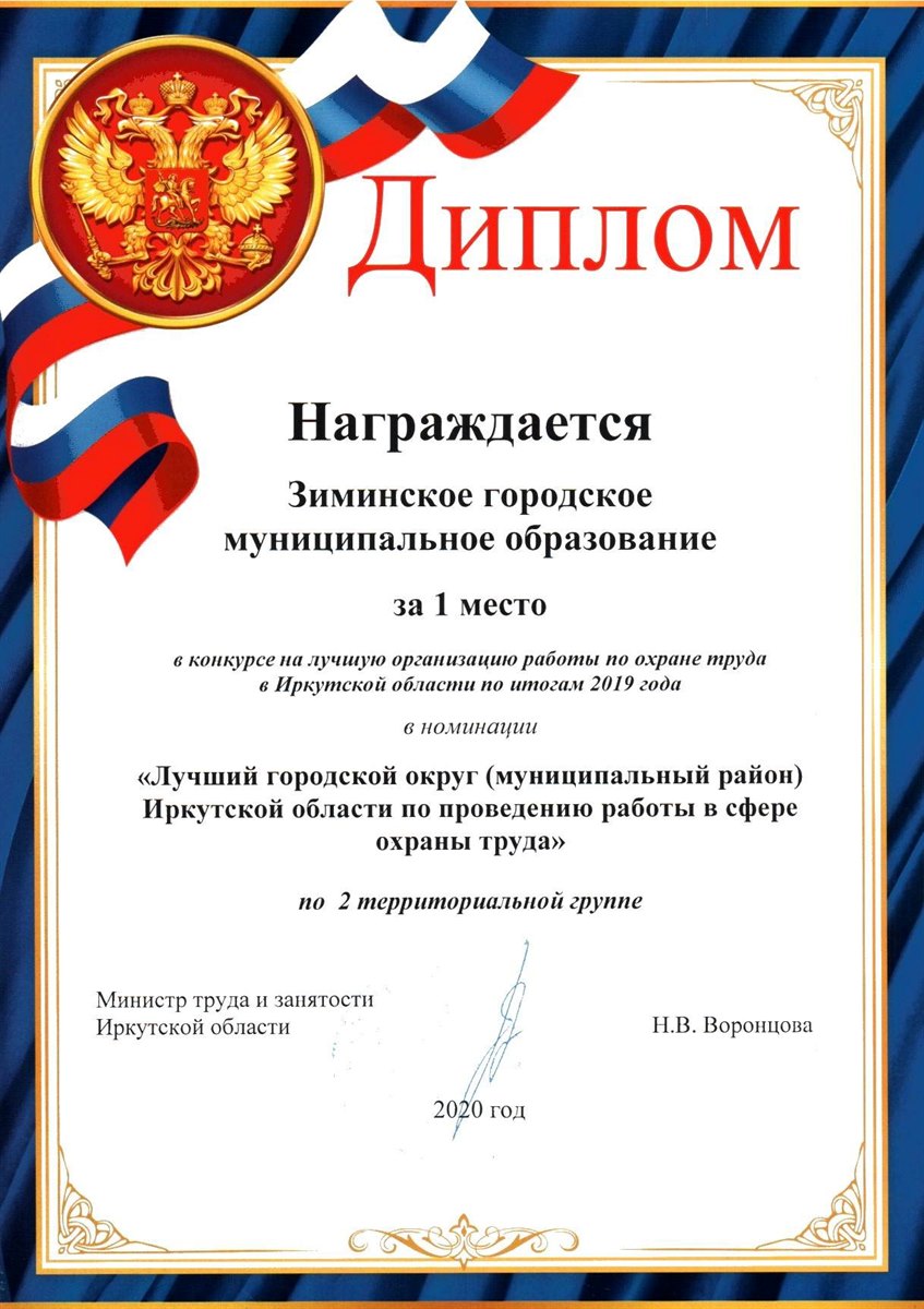 Диплом за 1 место в конкурсе за лучшую организацию работы по охране труда в Иркутской области по итогам 2019 года в номинации: «Лучший городской округ (муниципальный район) Иркутской области по проведению работы в сфере охраны труда».