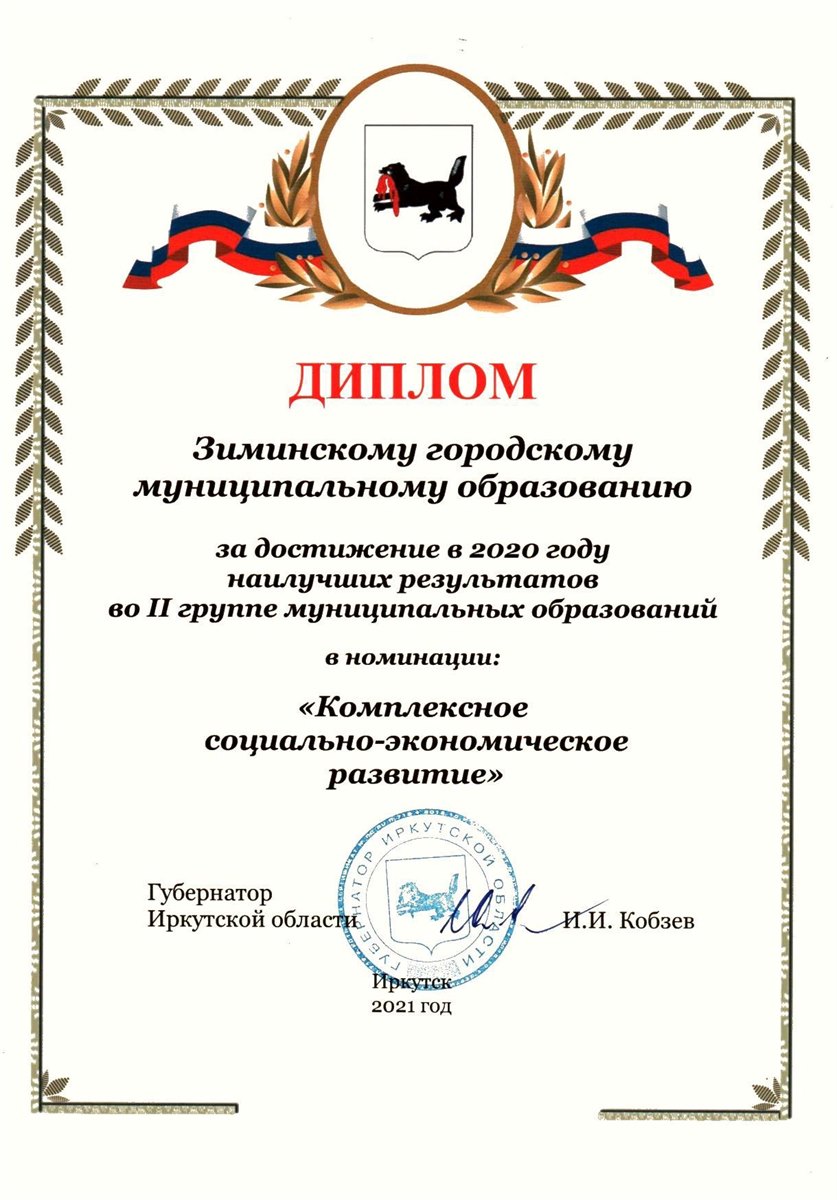 Диплом за достижение в 2020 году наилучших результатов во II группе муниципальных образований в номинации: «Комплексное социально-экономическое развитие»