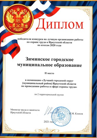Диплом за II место в конкурсе на лучшую организацию работы по охране труда в иркутской области по итогам 2020 года в номинации: «Лучший городской округ (муниципальный район) Иркутской области по проведению работы в сфере охраны труда» по 2 территориальной группе.