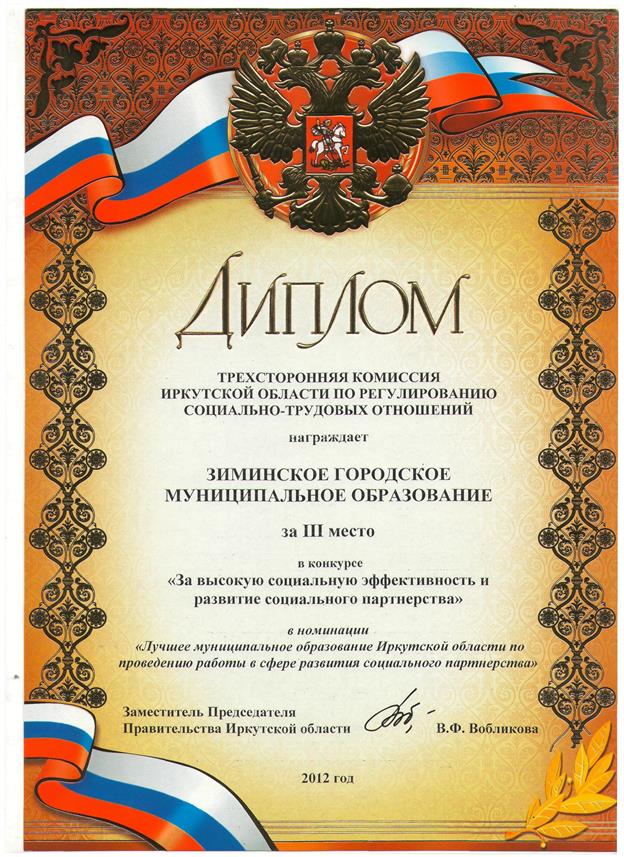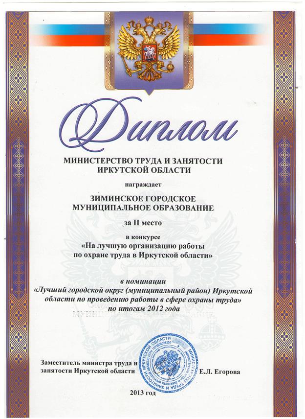 Лучший городской округ (муниципальный район) Иркутской области по проведению работы в сфере охраны труда по итогам 2012 года
