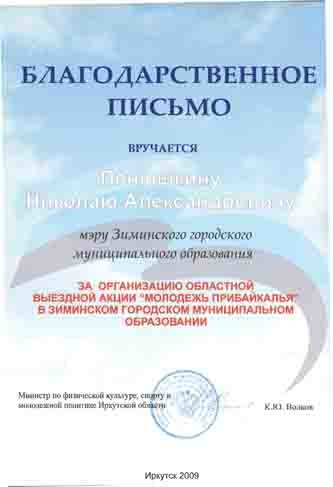 Благодарственное письмо за организацию областной выездной акции "Молодежь прибайкалья"