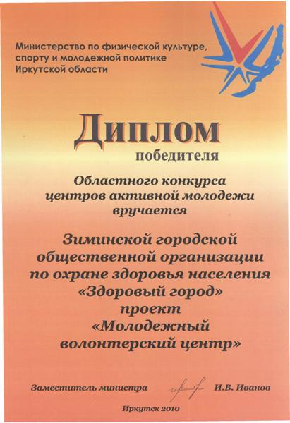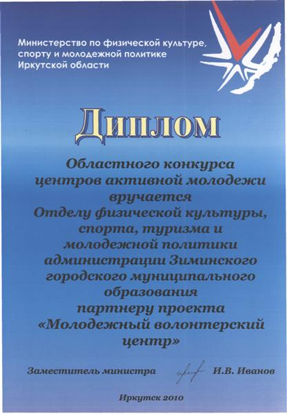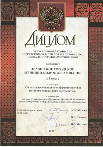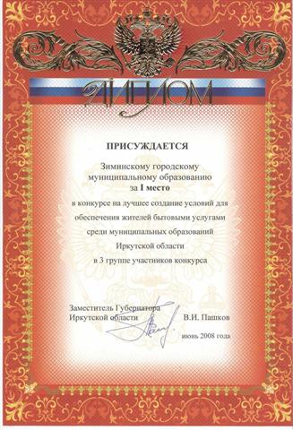 Диплом за 1 место в конкурсе на лучшее создание условий для обеспечения жителей бытовыми услугами среди муниципальных образований Иркутской области 2008 год