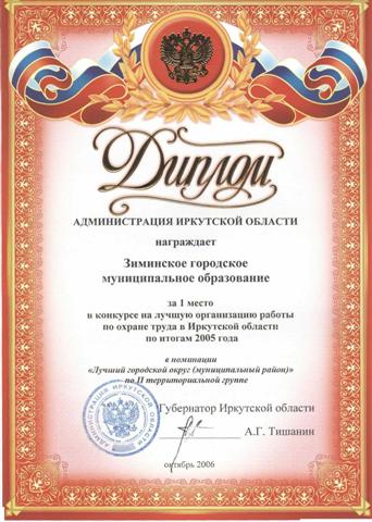 Диплом за 1 место в конкурсе Лучшее муниципальное образование Иркутской области 2005 год