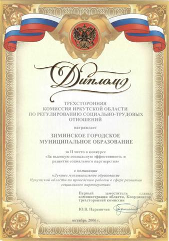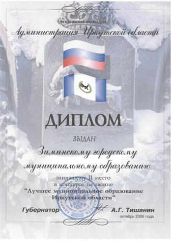 Диплом за II место в конкурсе Лучшее муниципальное образование Иркутской области 2006 год