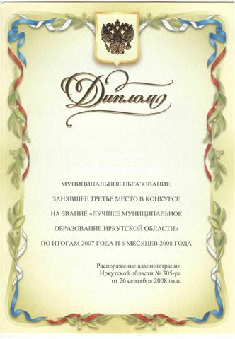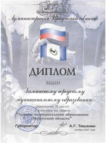 Диплом за II место в конкурсе Лучшее муниципальное образование Иркутской области 2007 год