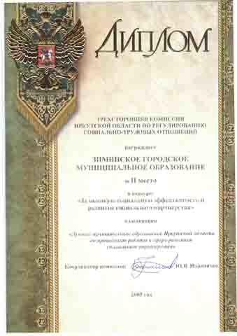 Диплом за II место в конкурсе Лучшее муниципальное образование Иркутской области по проведению работы в сфере охраны труда по итогам 2008 года