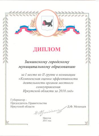 Комплексная оценка эффективности деятельности органов местного самоуправления Иркутской области за 2010 год