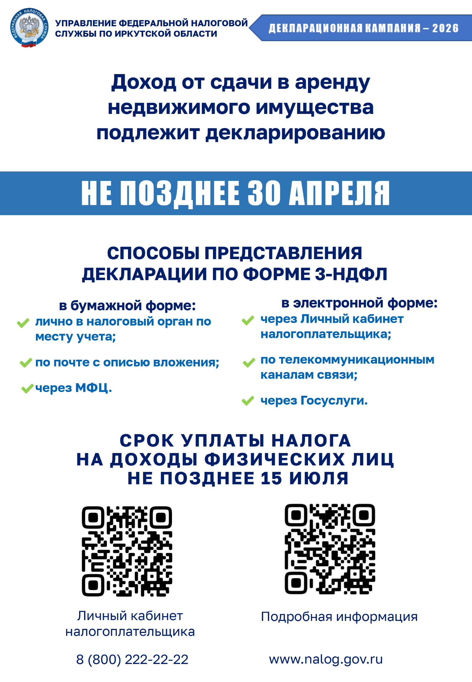 Срок представления налоговой декларации по форме З-НДФЛ не позднее 30 апреля