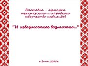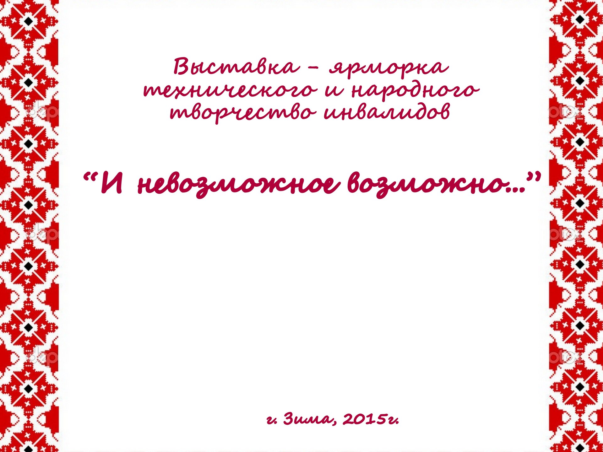 07.10.2015 г. в Историко- краеведческом музее прошла выставка – ярмарка прикладного творчества жителей Зимы и Зиминского района с ограниченными возможностями “ И невозможное возможно…” организованную Министерством социального развития, опеки и попечительства. Основной задачей этого мероприятия является привлечение людей с ограниченными возможностями здоровья, к творческому труду, что способствует реабилитации и социальная адаптация инвалидов посредством стимулирования развития технического и народного творчества. На этой выставке приняло участие 40 участников. В выставке -ярмарке приняли участие, инвалиды Зиминского Дома ремесел: Медведева Евгения, Салмин Владимир, Яровая Елена, Садовский Сергей.